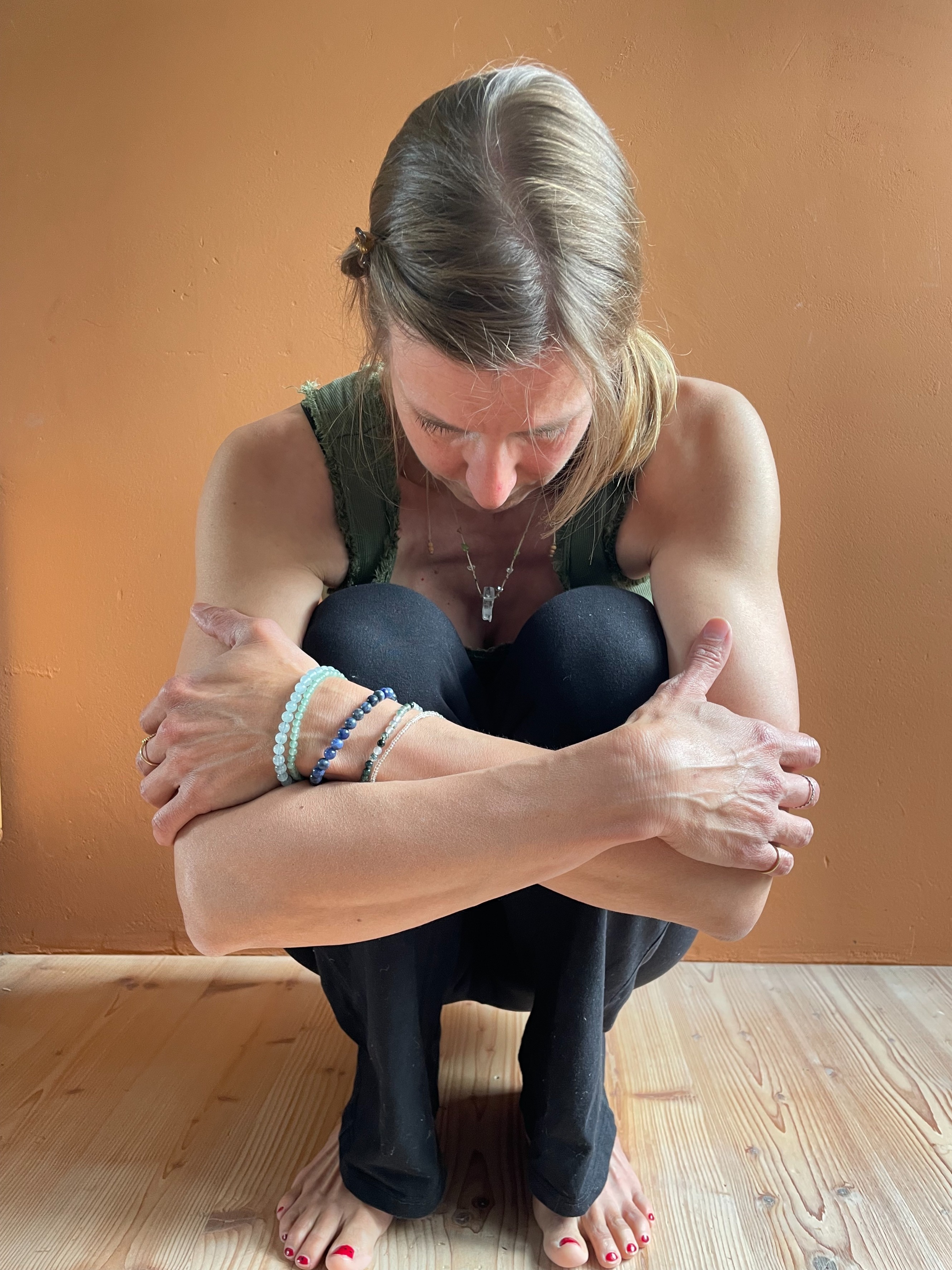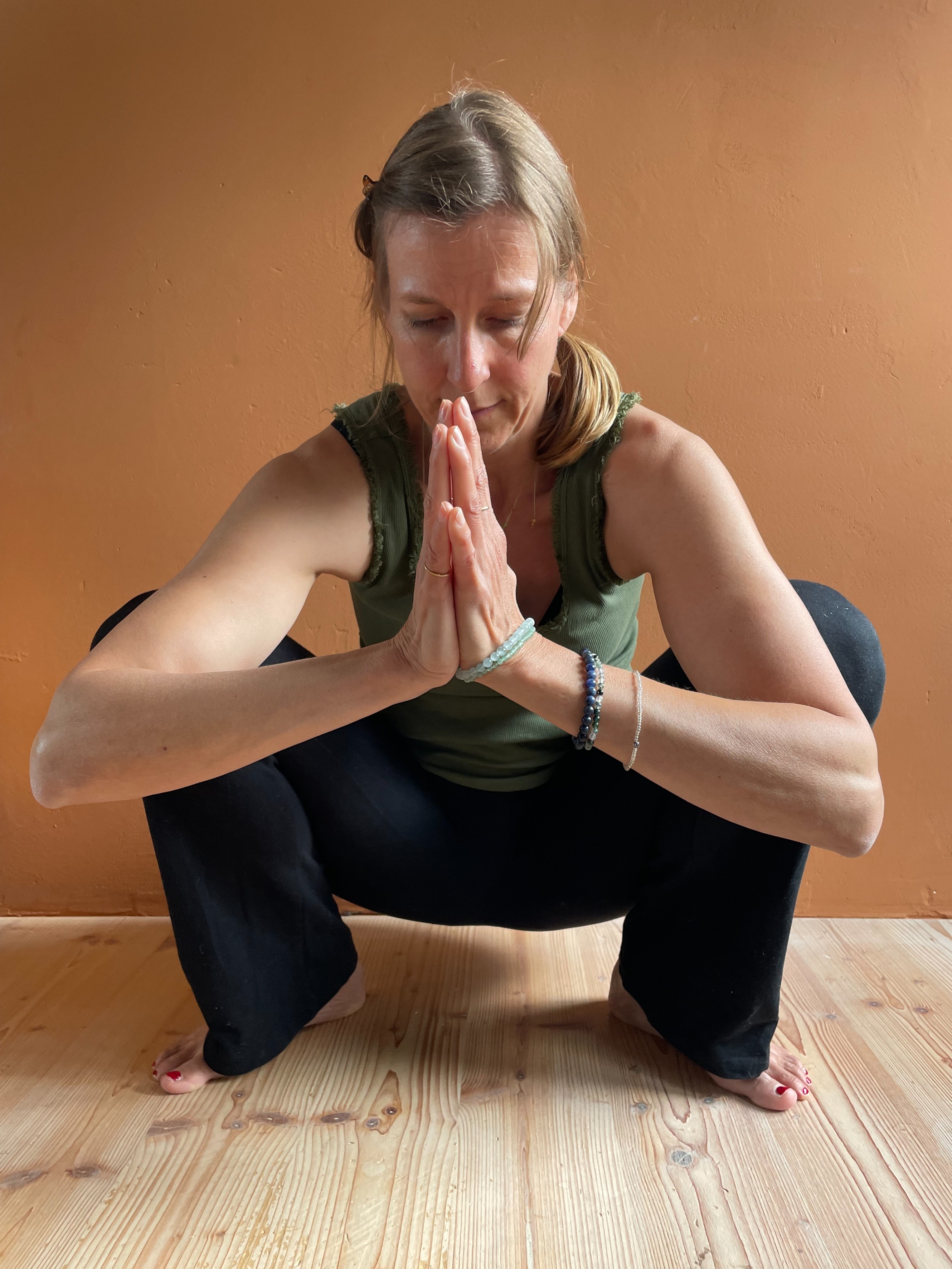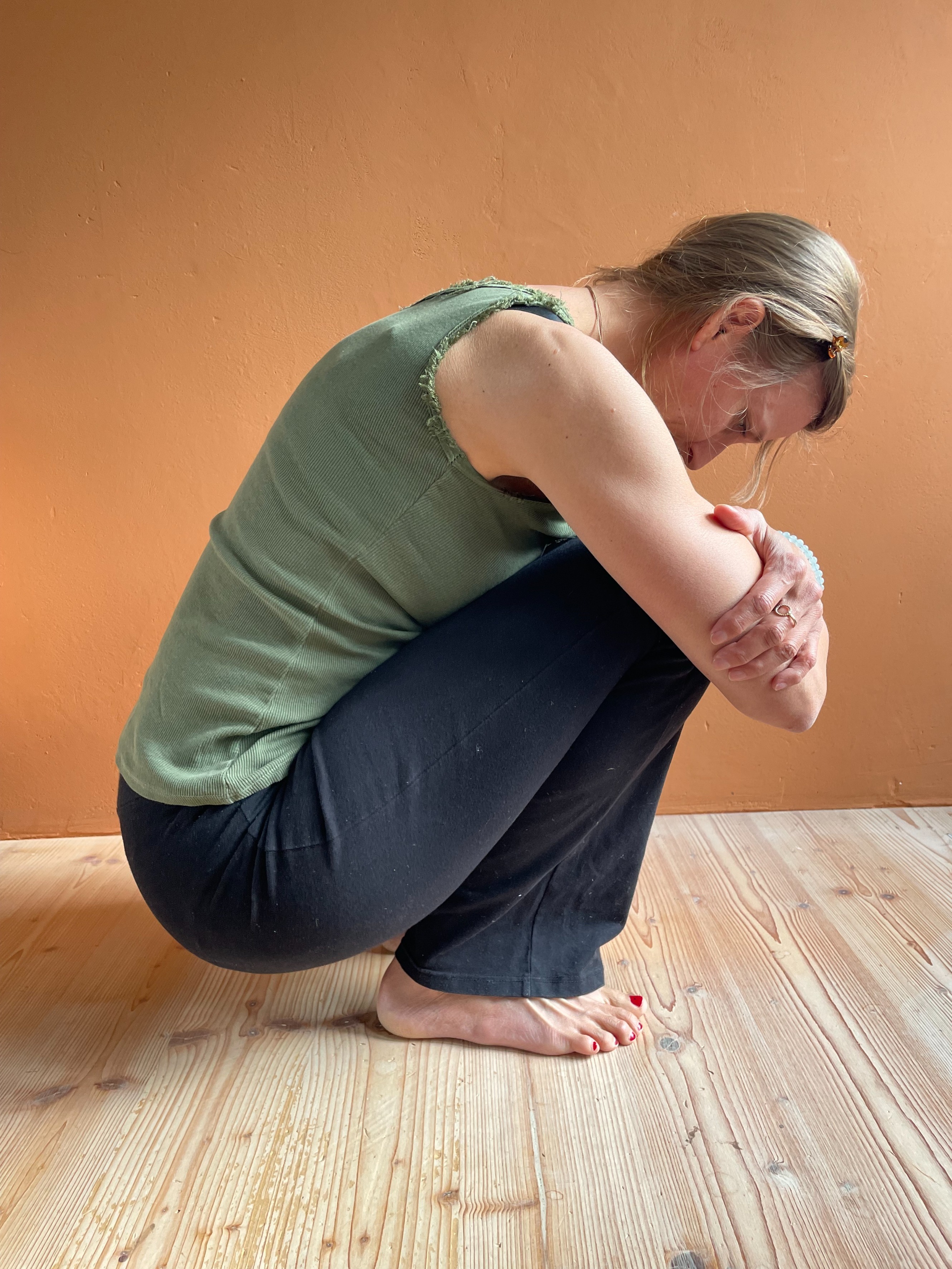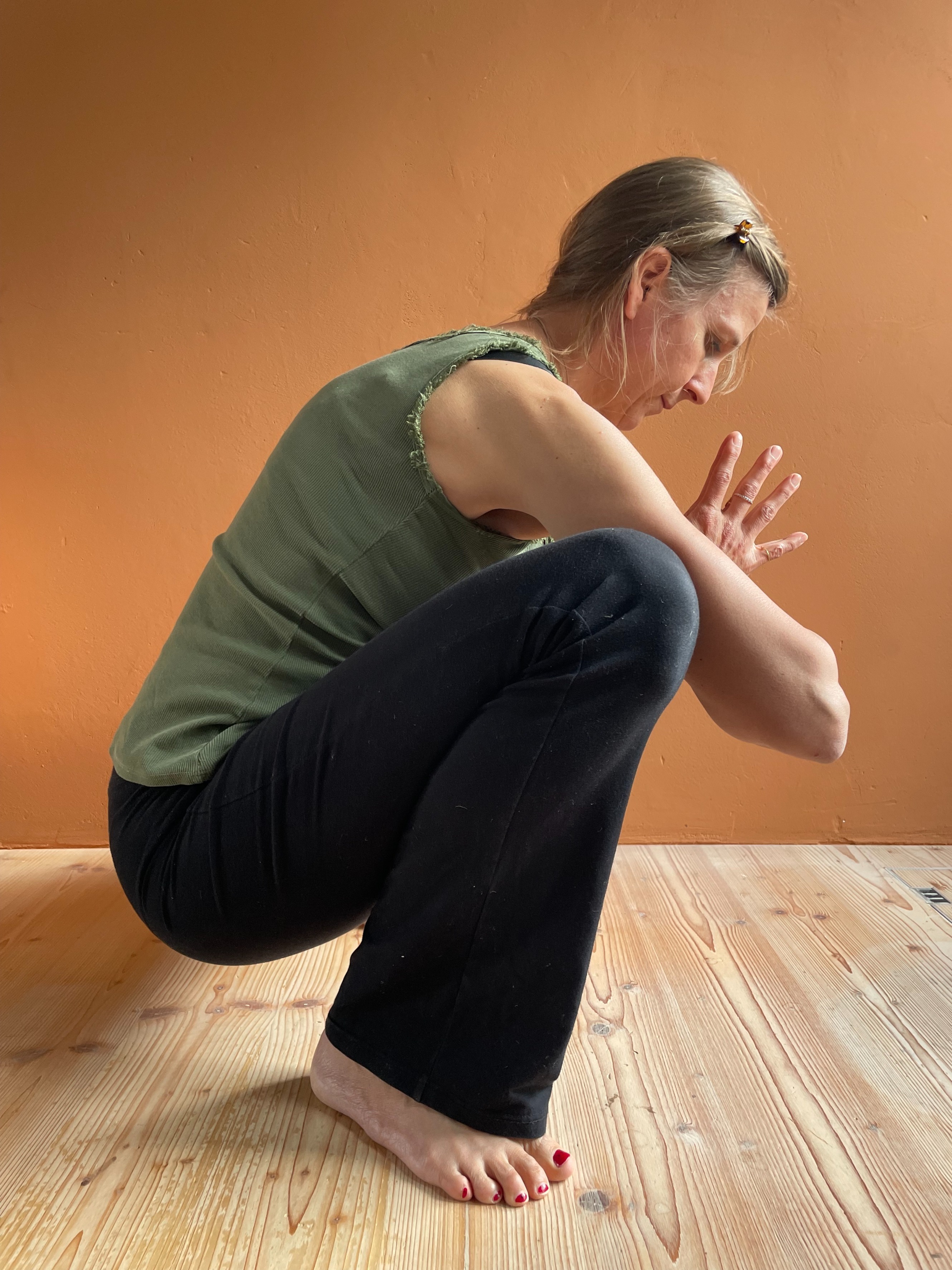 - setz dich in die schmale Hocke, die Füsse flach auf dem Boden.